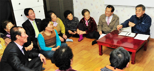 지난 1월 이동신문고 운영 당시 대청마을 주민들과 함께한 이재오 위원장 (desk@jjan.kr)