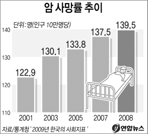 암 사망률은 2001년 122.9명에서 2003년 130.1명, 2005년 133.8명, 2007년 137.