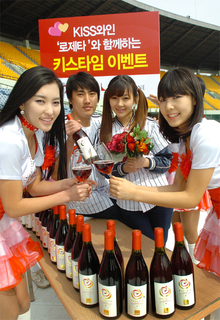 프로야구 개막을 앞둔 23일 잠실야구장에서 치어리더들이 로제타와 함께하는 키스타임 이벤트를 선보이고 있다. LG상사 트윈와인은 프로야구 시즌동안 야구장을 찾은 연인들을 대상으로 전광판을 통해 무작위로 선별된 연인이 키스를 하면 '바바 로제타'(BAVA Rosetta)를 주는 '키스 타임' 이벤트를 실시한다고 밝혔다. (desk@jjan.kr)
