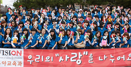 2008년에는 태안 기름 유출 현장을 찾아 봉사활동을 했고, 지난해에는 세이브칠드런 운동에 참여해 아프리카 신생아들을 위한 모자뜨기 행사를 가졌다. 올해도 1박2일의 MT 대신, 유니세프에서 펼치고 있는 '아우인형 만들기'에 동참했다.