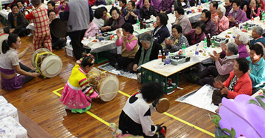 2부 행사에서는 관촌 원불교 어린이와 관촌교회 새싹어린이집이 앙증맞게 펼친'부끄 부끄 수퍼맨'과 난타 및 율동 공연이 노인들의 폭소를 자아냈다.