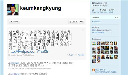 시트콤 '지붕뚫고 하이킥'으로 한층 젊어진 탤런트 정보석도 트위터에 빠져있는 스타다. '지붕킥'에 출연하면서 출연진과 찍은 사진을 올리기도 하고 연기 도중의 감상을 적었던 그는 최근 이 시트콤의 종영에 맞춰 팬들에게 종영 소감을 밝히기도 했다.