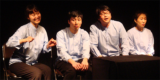 그런 점에서 T.O.D랑(대표 최정)의 두번째 소리연극 '찔레'(작·연출 임형수)는 많은 것을 덜어낸 연극이다. 세트라고는 의자 네 개와 테이블 한 개가 전부. 조명도 기본적인 조명만 쓴다. 의상도 따로 없다. 통일된, 일종의 유니폼을 맞춰입은 배우들은 연극이 끝날 때까지 단 한 번도 서로를 바라보지 않는다. 몸으로 줄 수 있는 정보를 최소화한 채 허공을 바라보며 대사를 읊는다. 배우들의 대사, 즉 청각적 이미지를 강조한 연출기법. 그래서 장르도 '소리연극'이다.