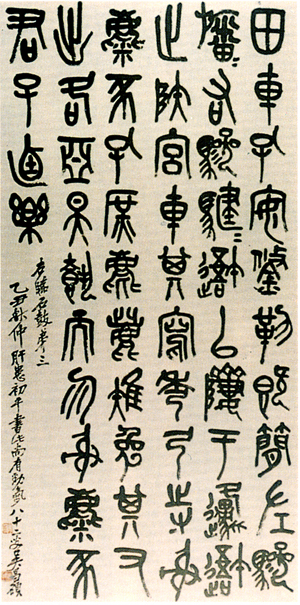 흔히 오창석의 예술을 종합하여 "전각이 제일이며, 서가 다음이고, 그림이 그 다음이다."라고 일컫는데 실제로 시서화각 사절로서 손색이 없다. 특히 전각의 근간이 되는 전서를 깊이 탐구하여 독자적 서풍을 확립하였으며, 이는 다시 전각과 문인화의 밑거름이 되었다. 전각을 제일로 손꼽지만 사실 그것은 전서의 연구에서 발양된 것이다. 무엇보다 중요한 것은 어느 분야나 서를 근간으로 삼아야만 전각과 그림에 품격이 생긴다는 점이다. 이는 서의 격에 따라 전각과 그림의 격이 달라지기 때문이다. 오창석이 어려서부터 부친을 통해 인장을 접하였지만 유독 전서를 연구하며 필력을 연마한 것도 그런 이유에서이다. 그가 전각가로서 또는 서화가로서 평생 임모의 대상으로 삼았던 것은 석고문(石鼓文)이다. 오창석이 임서한 석고문은 여러 본이 있다. 참고로 일본의 이현사에서 중국법서선60으로 영인한 전4폭의 임본은 75세 때에 서원사(西園寺) 공망(公望)의 부탁을 받아 쓴 것이다. 여기에 소개하는 임본은 관기에도 보이듯, 최말년기에 해당하는 82세 때(乙丑, 1925년)의 작품으로 오창석은 "을축년 한가을에 간 질환을 앓고 있던 초기에 썼으나 굳센 기운이 있다."라고 자평하였다. 오창석의 임석고문은 오늘날 문자학적 입장에서 보면 다소 이견이 있을 수 있으나 필법과 결구를 터득하는 데에는 무리가 없다. 마종곽은 오창석이 쓴 석고문을 보고 '매화를 그리는 법으로 썼다'고 평하였는데 그만큼 금석미가 풍부함을 지적한 말이다. 이외에 창작품으로 서령인사기를 비롯하여 수진택허당기(修震澤許塘記)가 널리 알려져 있으며, 록소융시삼장(錄小戎詩三章)이 뛰어나다. 오창석의 많은 작품들을 수습해보면 법고를 통한 창신이 어떻게 이루어졌으며, 어떻게 자기세계를 구축해야 하는지를 가늠할 수 있을 것이다.