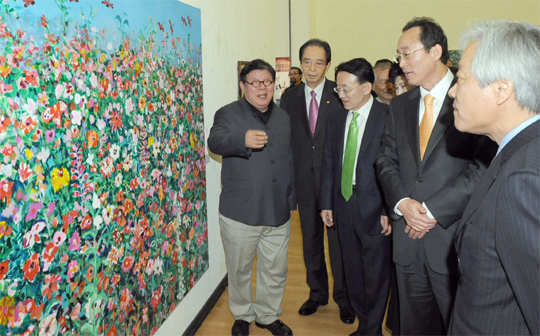 전주 MBC 창사 45주년 기념 특별기획 초대전 '남천 송수남'전이 7일 한국소리문화전당에서 열린 가운데 김완주지사를 비롯한 참석자들이 작품 설명을 듣고 있다. 이강민(lgm19740@jjan.kr)