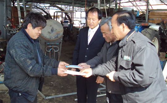 청웅면사무소 공무원과 주민들이 백혈병을 앓고 있는 이혜정양을 돕기 위해 모금한 성금을 이양의 아버지에게 전달하고 있다. (desk@jjan.kr)