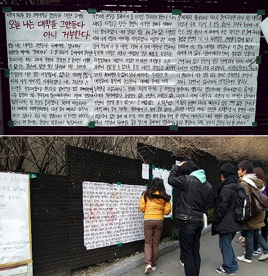 김예슬씨의 대자보가 붙은 얼마 뒤 서울대에 대자보를 붙인 채상원씨(서울대 재학)는, "오늘, 나는 대학을 거부한다. 아니, 싸움을 시작한다"고 뜻을 같이 한 뒤, 이렇게 말했다. "이 물음에 답해야 하는 사람, 대안을 만들 수 있고 만들어내야 하는 사람은 대학 교수님도, 정치인도 아니다. 바로 우리 대학생들이다. 우리의 삶을 그들에게 내맡길 수는 없다. 이에 나는 오늘 조용히 다짐을 해보려 한다. 자발적 퇴교와는 조금 다른 방법으로, 그러면서도 지금의 대학을 거부하기로. 대학의 주인이 되어 대학의 변화를 주도하기 위한 싸움을 벌이기로" 했다고. 믿음직하다. 그런데 나는 "대안을 만들 수 있고 만들어내야 하는 사람은 대학 교수님도, 정치인도 아니다. 바로 우리 대학생들이다"라는 말에 손발이 오그라들었다. 점잖게, '대학 교수님'은 아니란다. 나는 찍혔다.