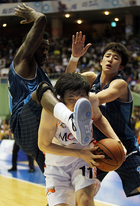 11일 오후 서울 잠실실내체육관에서 열린 프로농구 챔피언결정전 전주 KCC와 울산 모비스 6차전에서 모비스 김동우가 볼을 패스하려던 중 KCC 레더에게 파울을 당하고 있다. (desk@jjan.kr)
