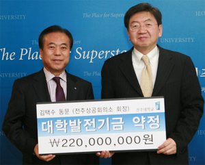 전주대 경영학부를 졸업한 김택수 전주상공회의소 회장이 13일 모교인 전주대를 방문, 대학발전기금 1억원을 기부했다.