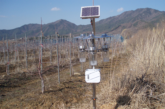 무인해충예찰시스템은 해충의 발생 밀도에 따라 적정한 농약 살포시기를 결정해주는 것으로 농약 살포 횟수를 줄여 안전한 과일 생산을 돕는 장점을 가지고 있다.