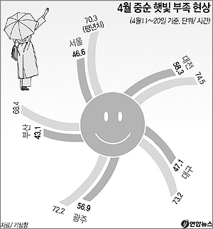 4월 중순(11∼20일)의 일조 시간은 서울 46.6시간, 대전 58.3시간, 대구 47.1시간, 광주 56.9시간, 부산 43.1시간으로 평년치(각각 70.3, 74.5, 73.2, 72.2, 68.4시간)의 70% 안팎에 불과했다.