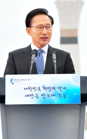 우리는 지금 대한민국의 미래를 여는 대역사의 현장, 새만금 방조제의 한 가운데 서 있습니다. 푸르고 아득한 바다, 먼 미래로만 생각했던 불가능의 역사가 우리 눈앞에 펼쳐져 있습니다. 새만금 방조제 준공을 온 국민과 함께 축하해마지 않습니다.