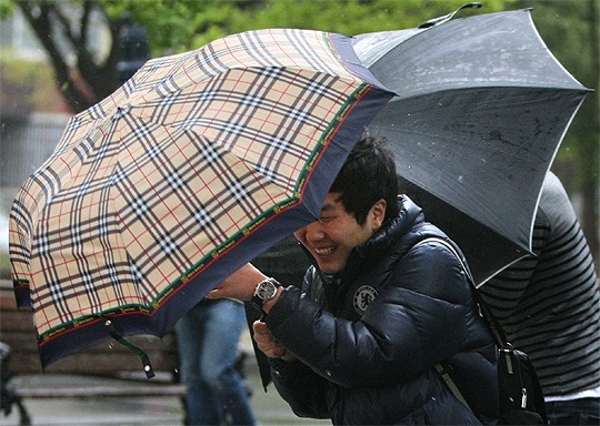 기상 관측 이래 4월 하순 낮 최고 기온이 최저를 기록한 28일 전북대학교 교정에서 학생들이 강한 비바람을 우산으로 막으며 걷고 있다. 안봉주(bjahn@jjan.kr)