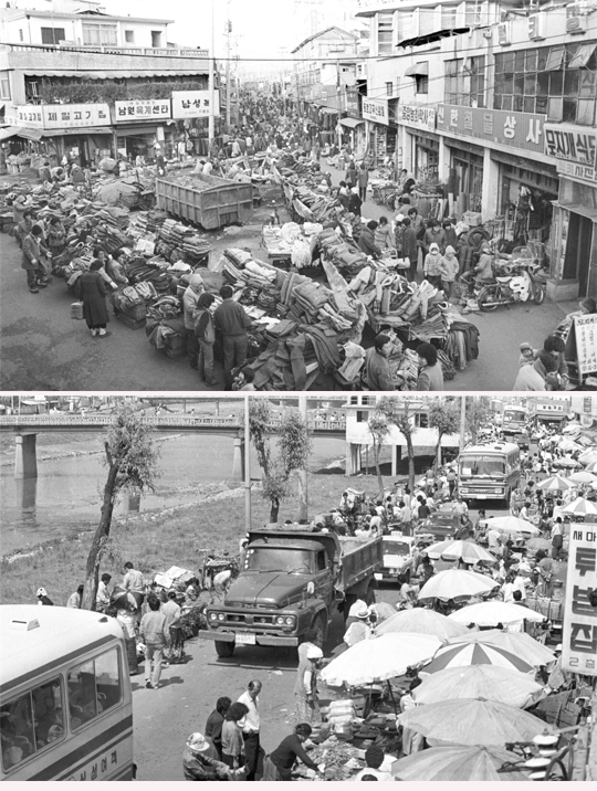 전주의 큰 시장은 남부·동부·서부·중앙시장과 금암동종합상가를 꼽을 수 있었다. 남부시장 매곡교에서 전주교 사이에 버스와 트럭, 택시 등이 북새통을 이루고 있는 사진(상)과 복개된 중앙시장의 팔달로에 쓰레기 수거 컨테이너와 노점상들이 길게 늘어서 있는 사진(하)을 보면 예나 지금이나 상가보다는 노점상 중심으로 상권이 형성됐던 것을 알 수 있다. 노점상이 갑작스레 늘었던 것은 구매가 편리하고, 가격이 저렴하기 때문에 주부들이 쉽게 이용할 수 있어서다. 또한 시장은 물건을 사고 파는 장소 뿐만 아니라 소식을 주고 받는 장으로서도 큰 역할을 했다.