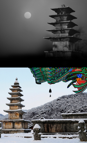 해가 떠오르자 익산 왕궁리 5층 석탑(국보 제289호)의 고풍스런 자태가 드러났다. 정교함과 화려함을 다듬어 범접하기 어려운 기품이 있다. 서효석 전주영상회 회장은 "석탑 하단이 공사중인 까닭에 흑백 사진을 내놓게 됐다"며 "사계절을 익산 왕궁리 5층 석탑과 함께하는 행운을 누렸다"고 말했다.