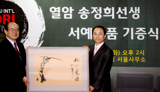 열암 선생은 충무공 이순신 장군 대첩비의 휘호를 비롯해 현대그룹의 '現代'와 드라마 '왕과나' 글씨, 2006년 월드컵 당시 태극전사들의 가슴에 새겨져 있던 '투혼'이란 글씨를 쓴 원로 서예가. 지난 4일 소리축제 서울사무소를 찾아 김명곤 조직위원장에게 작품을 전달한 열암 선생은 "작은 성의나마 내 작품들이 열번째 소리축제가 성공적으로 개최되는 데 밑거름이 되길 바란다"고 말했다.