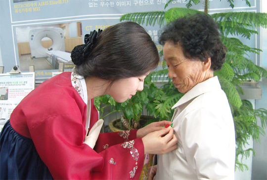 고창종합병원 직원이 진료를 받으러 온 어르신의 가슴에 카네이션을 달아 드리고 있다. (desk@jjan.kr)
