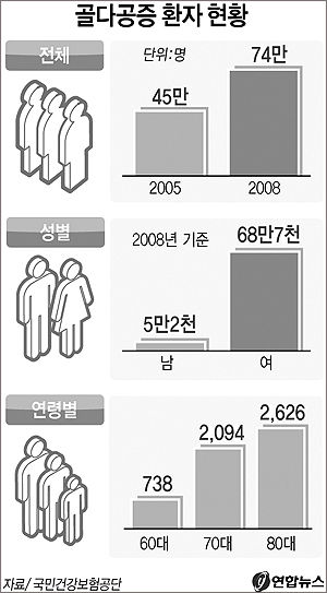 지난해 전체 골다공증 진료환자는 74만명으로 2005년 45만명에서 연평균 13%씩 늘었다.