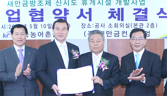 한국농어촌공사는 10일 오전 이스타항공그룹 계열 ㈜새만금관광개발(대표이사 이경일)이 주도하는 ㈜새만금컨소시엄과 '새만금방조제 신시도 휴게시설 민간투자사업'을 위한 협약식을 체결했다.