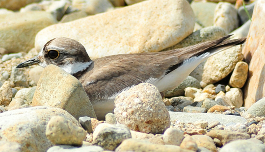 11일 전주천에서 만난 흰목물떼새가 인기척을 느끼자 자갈 사이로 몸을 웅크리고 있다. 안봉주(bjahn@jjan.kr)