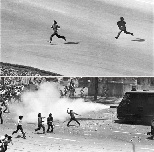 발이 빠르냐, 곤봉이 빠르냐. 한 대학생이 데모를 하다 경찰과 쫓고 쫓기는 추격전을 벌이고 있는 사진이다.