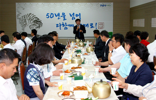 농협 전북지역본부 김종운 본부장 등 전체 임직원이 24일 상생관에서 쌀막걸리 시식행사와 쌀 판매 확대 및 사업추진 결의대회를 개최했다.