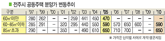 전주지역 공동주택 분양가가 최근 주택시장 침체와 소형평수 선호 등이 맞물려 실수요자 공급 위주로 전환되면서 5년 전 수준으로 회귀하고 있다.