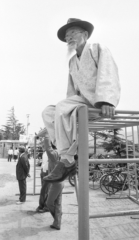 제13대 4·26 총선이 열렸던 1988년 4월. 당시 남원 용봉국민학교에서 열린 유세장에서 한 할아버지가 어린이 놀이기구에까지 올라가 앉아 후보의 연설을 경청하고 있다. 위험해 보이기도 하지만, 선거에 대한 유권자들의 관심이 얼마나 높았는지 짐작할 수 있다.