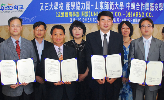 우석대학교(총장 라종일)와 중국 산동사범대학 중한합작국제상학원(원장 샤통쉐이), (주)AR&G(사장 변문성)가 7일 대학 본부 소회의실에서 한·중 무역 발전을 위한 산학협약을 체결했다.