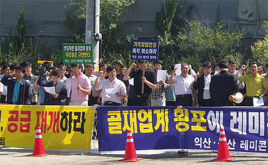 속보= 전북레미콘협동조합의 익산·군산협의회 소속 레미콘업체들은 8일 익산 낭산면의 한 골재업체 앞에서 집회를 갖고 "가격담합인상 행위 중단하고 공급 재개하라"고 주장했다.