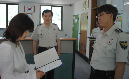무주경찰서 설천파출소 박성일 경사가 주민이 뽑은 우수 경찰로 선정돼 9일 황대규 무주경찰서장 및 마을주민 등이 참석한 가운데 설천면 마을주민 김이분씨로부터 표창장을 전달받았다.