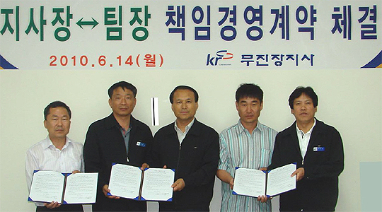 한국농어촌공사 무진장지사(지사장 김대영)는 14일 지사 소회의실에서 부서내 팀장 등이 참석한 가운데 지사 '10년 경영목표 달성과 분권형 자율경영체제를 구축하기 위한 지사장·팀장간 책임경영계약'을 체결했다.