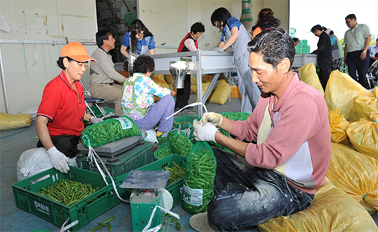 순창 복흥면 주민들이 수확한 완두콩을 판매하기 위해 부지런히 포장작업을 하고 있다. (desk@jjan.kr)