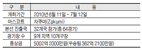 전세계 축구팬들의 한마음 축제인 '2010 남아프리카공화국 월드컵'이 지난 11일 시작됐습니다. 내달 12일까지 열리는 남아공월드컵은 32개 나라 대표 선수들이 4팀씩 8개조(A~H조)로 나뉘어 우승을 목표로 열띤 경쟁을 벌이는데요. 원정 사상 첫 16강 진출이라는 목표를 세운 대한민국은 B조에 속해 그리스, 아르헨티나, 나이지리아와 예선경기를 갖습니다. 이번주에는 월드컵에 대해 알아봅시다.