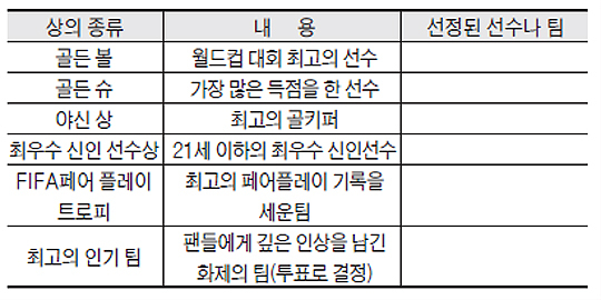 ▲월드컵 대회가 끝난 후 FIFA에서 선정하여 주는 상은 여섯 종류가 있다고 해요. 상 이름과 내용을 알아본 후 모둠별로 수상자를 선정해보세요.