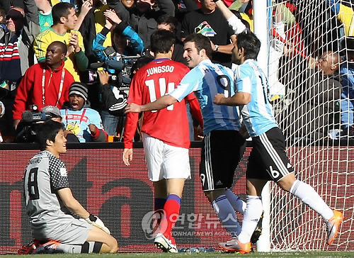 허정무 감독이 이끄는 축구대표팀은 17일(한국시간) 요하네스버그의 사커시티 스타디움에서 열린 아르헨티나와 2010 남아프리카공화국 월드컵 B조 조별리그 2차전에서 박주영의 자책골에 이어 곤살로 이과인에게 해트트릭을 허용하며 1-4로 무릎을 꿇었다.