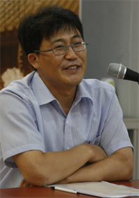 19일 최명희문학관(관장 장성수)의 한국도서관협회 문학나눔사업추진반 모니터링 문학 활동 특강에 초대된 소설가 김종광(39)씨. 다소 어눌한듯 하지만 '허허실실 전법'으로 이야기를 풀어갔다. 지난해 12월 펴낸 청소년소설 「착한 대화」, 올해 펴낸 장편소설 「군대 이야기」와 단편집 「처음의 아해들」까지 잇달아 발표한 신간을 두고 "몰아서 쓰기도 하고, 운이 좋은 편이기도 하다"고 말했다. 그의 소설은 우리 사회 각 분야의 병폐를 우회적으로 비판한다. 상류 계층의 허위와 위선, 권위주의와 소비주의 문화, 무식한 대학생들과 방황하는 청소년에 이르기까지 대상은 각양각색. 그는 "소설의 운명은 동시대에 대한 기록"이라고 했다. 가난한 삶의 모습을 담되 비판정신이 살아 있어야 한다는 뜻이다.