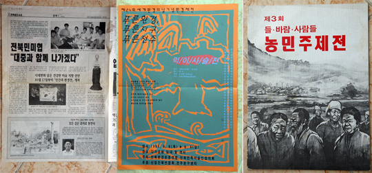 (왼쪽부터)1997년 전북일요시사-전북민미협 소개, 민미협·환경연합·먹이사슬전 포스터.1996년, 들바람사람들정기전.1990년 (desk@jjan.kr)