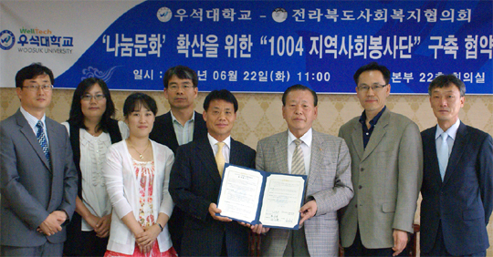 우석대학교(총장 라종일)와 (사)전라북도사회복지협의회(회장 서금성)가 22일 협약을 체결하고 사회복지자원봉사활동을 통한 나눔 문화를 확산시켜 나가기로 했다.