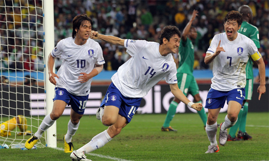 23일 남아공 더반 스타디움에서 열린 한국과 나이지리아 월드컵 조별리그 3차전에서 이정수가 동점골을 넣은 뒤 박지성, 박주영 등 동료들과 환호하고 있다. (desk@jjan.kr)