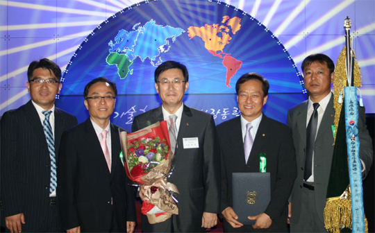 24일 서울 코엑스에서 열린 '2010 대한민국 창업대전'에서 창업지원 기관부문 최우수인 국무총리상을 수상한 강희성 호원대 총장(가운데)이 관계자들과 함께 기념촬영을 하고 있다. (desk@jjan.kr)