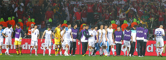 27일 새벽 남아공 포트엘리자베스에서 열린 월드컵 16강전에서 한국축구대표팀이 우루과이에 패하며 8강 진출에 실패했다. 경기를 마친 뒤 선수들이 붉은악마에게 인사를 한 뒤 발길을 돌리고 있다. (desk@jjan.kr)