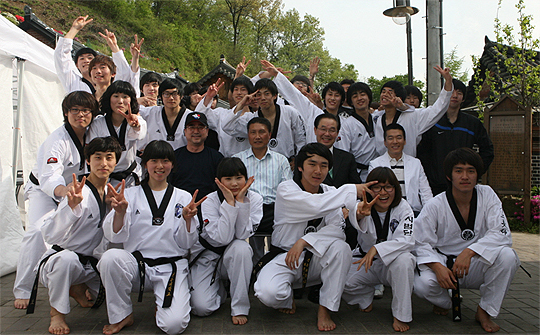 전주대학교 태권도 시범단이 한지로 만든 도복을 입고 뛴다.