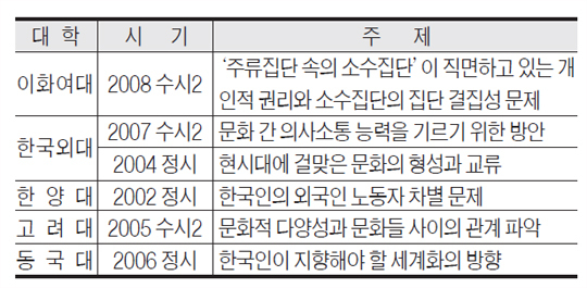 많은 대학 논술고사에서 문화의 다양성 혹은 다문화주의라는 주제이다. 2000년 이전까지는 문화의 상대성과 다양성의 측면에서, 2000년 이후에는 다문화에 관련된 내용을 다루고 있다. 특히 농촌 인구에 4분의 1이 다문화 가정이라 할 정도로 다문화 사회로 변해가고 있다. 또한 국제간 교류도 활발하게 전개되고 있다.