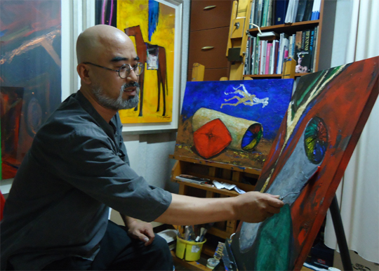 작업실엔 '배게 시리즈'가 걸려 있었다. 그의 과거와 현재를 알 수 있는 공간이었다. '배게'는 그가 오랫동안 고민했던 주제. 1990년대 후반 전북예술회관 일대에서 퍼포먼스 바(bar)를 운영했던 그는 새벽이 되어서야 잠을 청할 수 있었다. 그에게 베게는 어머니 품 속 같은 따뜻하고 안락한 매개체였다. 평화와 안식, 자유를 꿈꾸는 작가의 고뇌가 편안하게 다가오는 것도 이와 무관하지 않다. 십자가로 형상화된 새와 짙은 암갈색 말은 미지의 세계로 안내하는 매개체다.