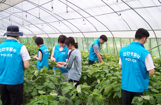 진안경찰서 청렴동아리 '데미샘'회원들은 지난 2일 오전 진안 안천면 노성리 노채마을 응웬티 투이계우씨(25·베트남) 농가를 방문해 깻잎 수확 봉사활동을 전개했다.