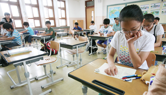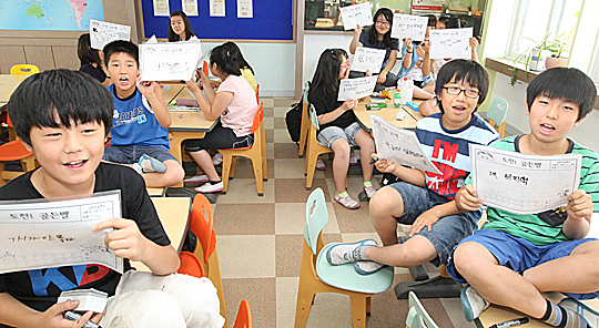 국가수준 학업성취도 평가(일제고사)가 일제히 치러진 13일 오전 9시, 전주시내 A초등학교 2층 영어전용교실. 평가를 거부한 이 학교 6학년생 19명이 교사와 함께 국어과목 대체프로그램으로 '속담 골든벨'을 맞추고 있다.