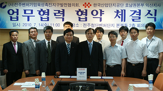 전주벤처기업육성촉진지구발전협의회가 한국산업단지공단 호남권 본부 익산지사가 14일 전주첨단벤처단지 본부동에서 지역 중소기업 육성의 효율성 제고를 위한 업무협약을 체결했다. (desk@jjan.kr)
