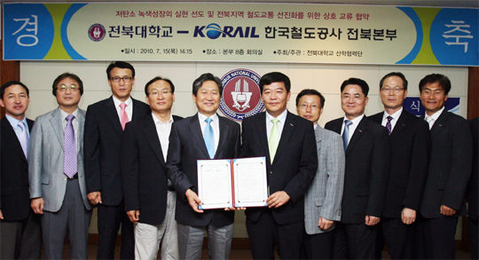전북대학교(총장 서거석)와 한국철도공사 전북본부(본부장 최덕률)가 녹색 철도이용 생활화를 통한 저탄소 녹색성장 실현과 전북지역 철도 교통 선진화를 위한 협약을 체결했다.