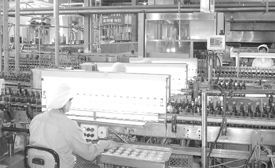 하이트 주조(주)의 소주생산 공장에서 직원들이 제품화 된 하이트 소주의 불순물 여부 등을 확인하고 있다. (desk@jjan.kr)